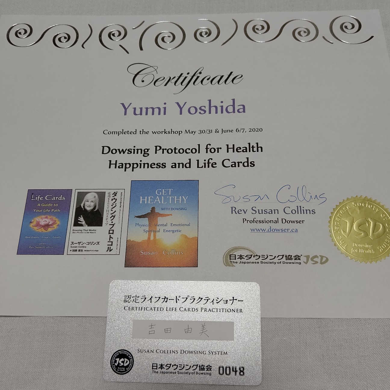 2020-08-17 ライフカードのプラクティショナー ダウジング プロのダウザー(ダウジングする人をダウザーと言います)スーザン コリンズさんの ダウジングプロトコルを受けました 自分のダウジングレベルが確実にアップしたのがわかりました ライフカードのプラクティショナーの証書頂きました 何書いてあるかわからんけどな😊 9月はプロのダウザーコースを受けます